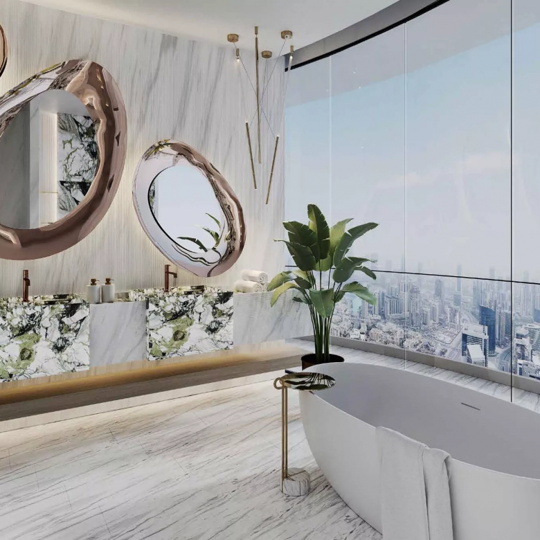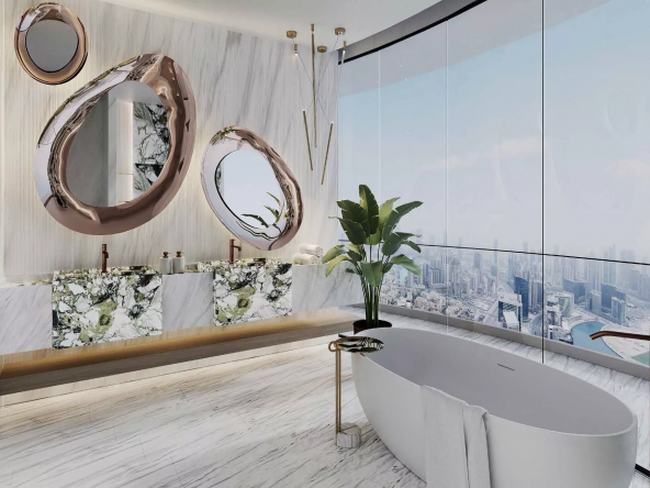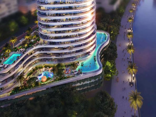 In terms of the layouts, each property will have a rounded balcony overlooking the Dubai Water Canal or the famous Burj Khalifa. At the same time, duplex owners will have a walk-in closet in the master bedroom, a maid’s room and a private swimming pool on their balcony.
