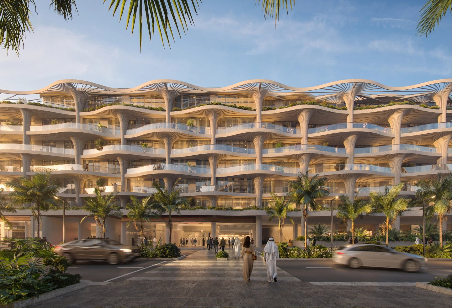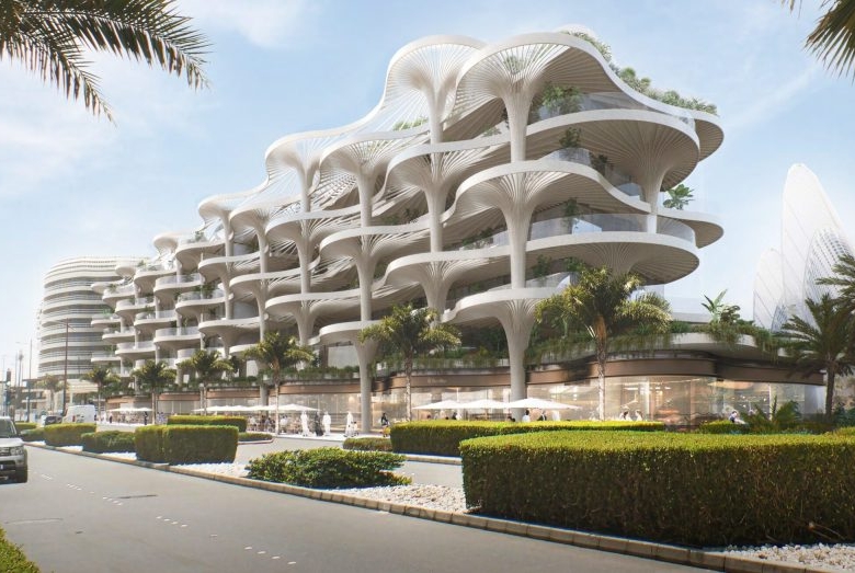 The façade draws its aesthetic and functional essence from nature, with architecture that respects the environment while providing unparalleled luxury. Takada’s signature style flows through the project, bringing the nature-inspired design to each corner of the building. Every curve, every undulating line mimics the forms of a lush forest canopy, bringing a sense of calm to the structure. Low-rise, yet visually captivating, the building seems to grow from the island’s landscape, merging seamlessly with its surroundings. Each residence reflects an atmosphere of serenity, with expansive layouts that invite abundant natural light and frame panoramic views of the nearby Guggenheim Abu Dhabi. The intricate detailing, along with design philosophy, elevates this façade to an exclusive address rooted in the harmony of the natural world.